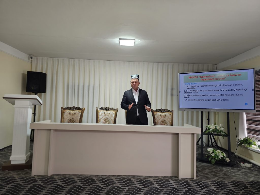 Dastur davomida Konstitutsiyaning davlat va jamiyat hayotidagi o‘rni, fuqarolarning huquq va erkinliklarini ta’minlashdagi asosiy tamoyillar haqida atroflicha ma’lumot berildi. Shuningdek, ishtirokchilarga Qomusimizda belgilangan demokratik qadriyatlar, huquqiy islohotlar va fuqarolik mas’uliyatining ahamiyati borasida tushunchalar yetkazildi.